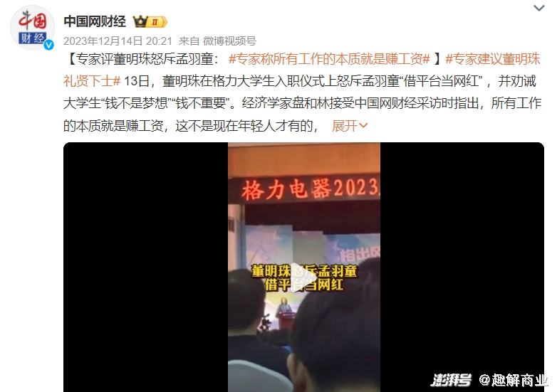 直到12月份,董明珠在格力电器2023届大学生入职仪式中发言,并以孟羽童为负面案例,批评其做不好秘书本职工作,称其只是“借助我们平台变成一个网红,不能容忍这样的人在格力,所以把她开除了”。