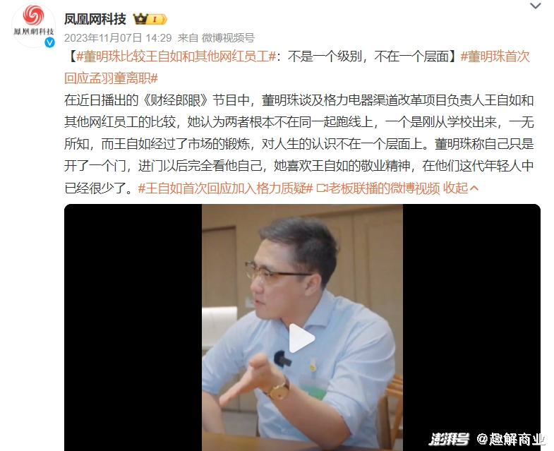 先是与“未来接班人”孟羽童的“爱恨情仇”被热炒。2023上半年,孟羽童在社交媒体上发布视频称其已经从格力电器离职,未来将会继续读书深造。然后网友们开始揣测“真实内幕”:有网友称孟羽童离职是为了去做直播、变现流量,不过被其否认;也有自媒体爆料称孟羽童是被格力开除而并非主动离职。