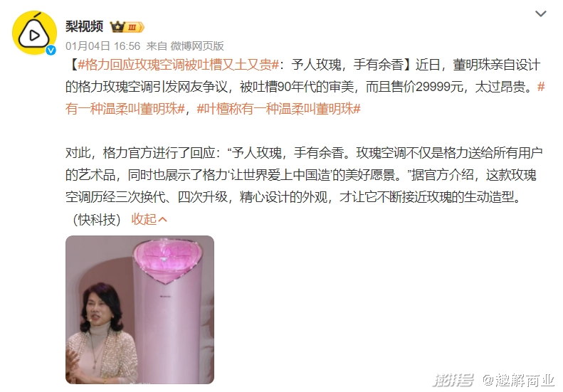 格力的“网红”气质还体现在一系列“博人眼球”的新品。其中最典型的或许就是董明珠参与设计的玫瑰系列空调,被网友嘲讽“90年代审美”、“又丑又土又贵”。值得一提的是,格力官方对此回应道,该款空调是历经三次换代、四次升级的艺术品。