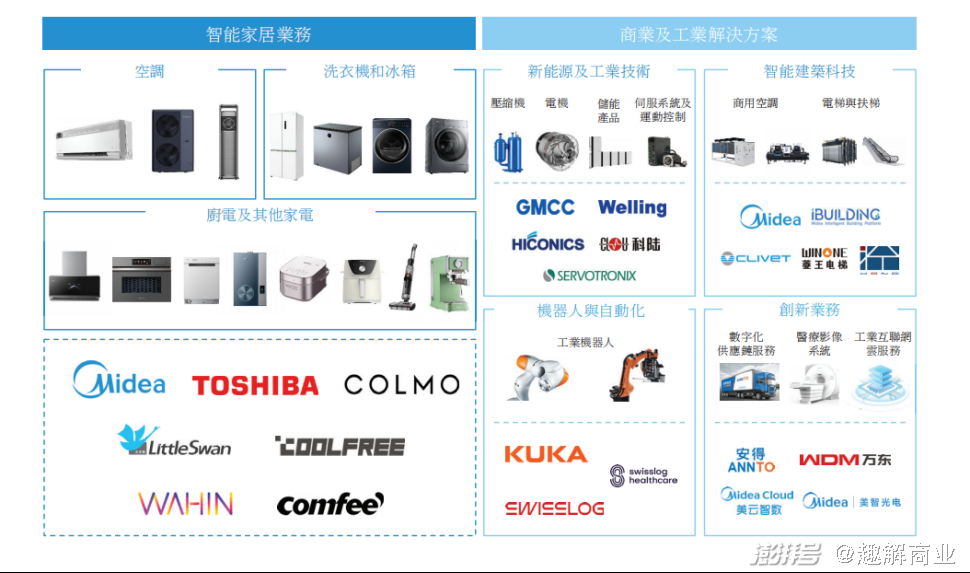 据“趣解商业”不完全梳理,美的近年来收购的企业包括:2017年斥资305亿收购国际工业机器人巨头库卡集团,进军机器人与自动化市场;2020年先后收购菱王电梯和合康新能,进入楼宇电梯和新能源汽车市场;2021年收购影像产品和服务提供商万东医疗,拓展医疗影像业务;2023年收购上市公司科陆电子(002121.SZ),进军储能行业。美的已经将自己定义为“一家覆盖智能家居、工业技术、楼宇科技、机器人与自动化和其他创新业务的全球化科技集团”;去年10月份,美的集团还向港交所主板提交了上市申请书。