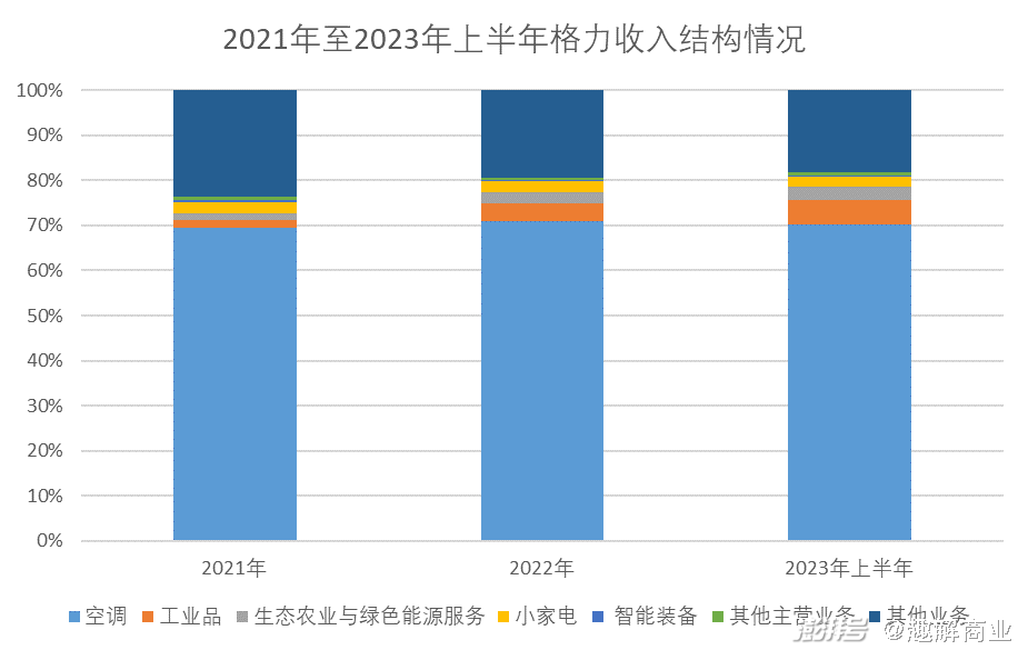 资深家电行业分析师刘步尘认为:格力的多元化转型在2010年之前已经开始,但到2023年上半年为止,空调之外的产品对格力电器的营收贡献率不到10%,经营业绩仍高度依赖空调业务,一定程度上折射出格力多元化并不成功。