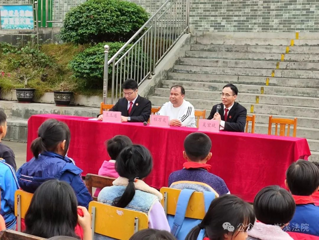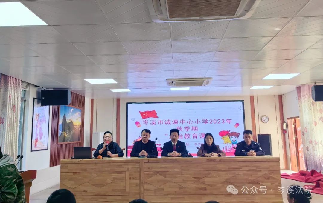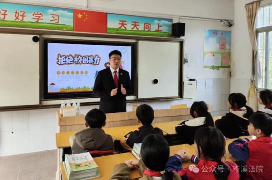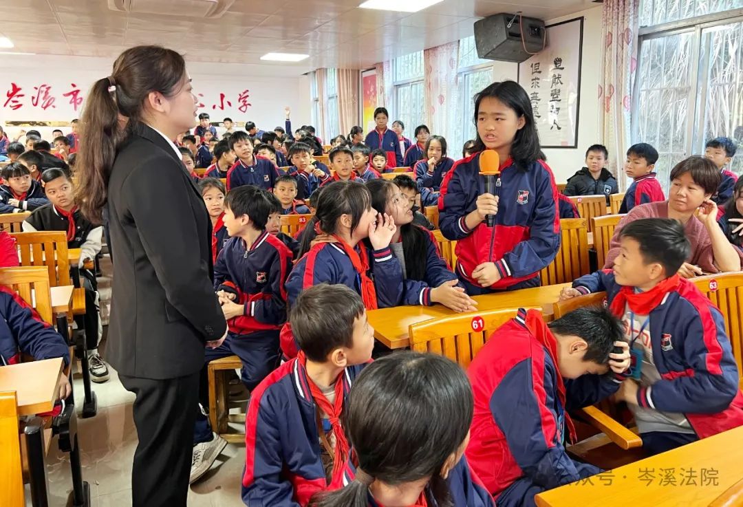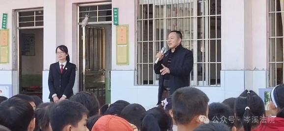 岑溪法院执行局副局长、梨木镇白护小学、河木中心小学法治副校长吴宏斌带领执行局干警以“法治宣讲进校园 共护青春伴成长”为主题开展法治宣传进校园活动,吴法官首先阐述了校园法治建设的重要性及开展学生法治教育的必要性。