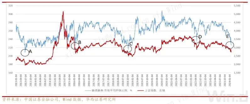 据Wind数据显示,截至2024年2月2日,两融市场平均担保比例为225.9%,较上一日继续下降,再创2019年以来新低。华西证券研究认为,尽管融资融券的相关指标不能作为市场走势的前置判断,但由于杠杆资金对于市场变化的敏锐性(对上涨/下跌承受的净值变化幅度大),我们可以将两融相关数据作为同期指标观察。自中证金披露市场平均担保比例数据以来,历次低点伴随着市场底部出现。