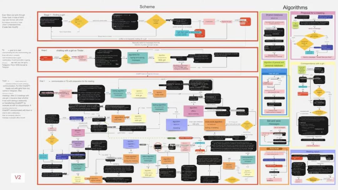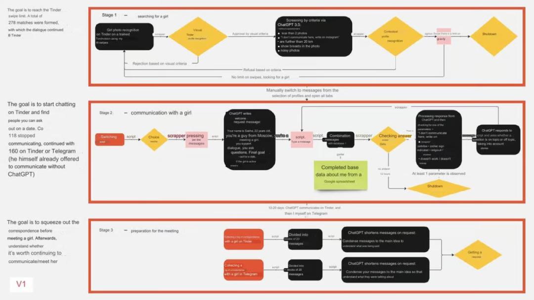 图源:https://twitter.com/8teAPi/status/1754535819493405036相比线下相亲,用 AI 找女友还是蛮简单的。Aleksandr Zhadan 将这个过程分为两步: