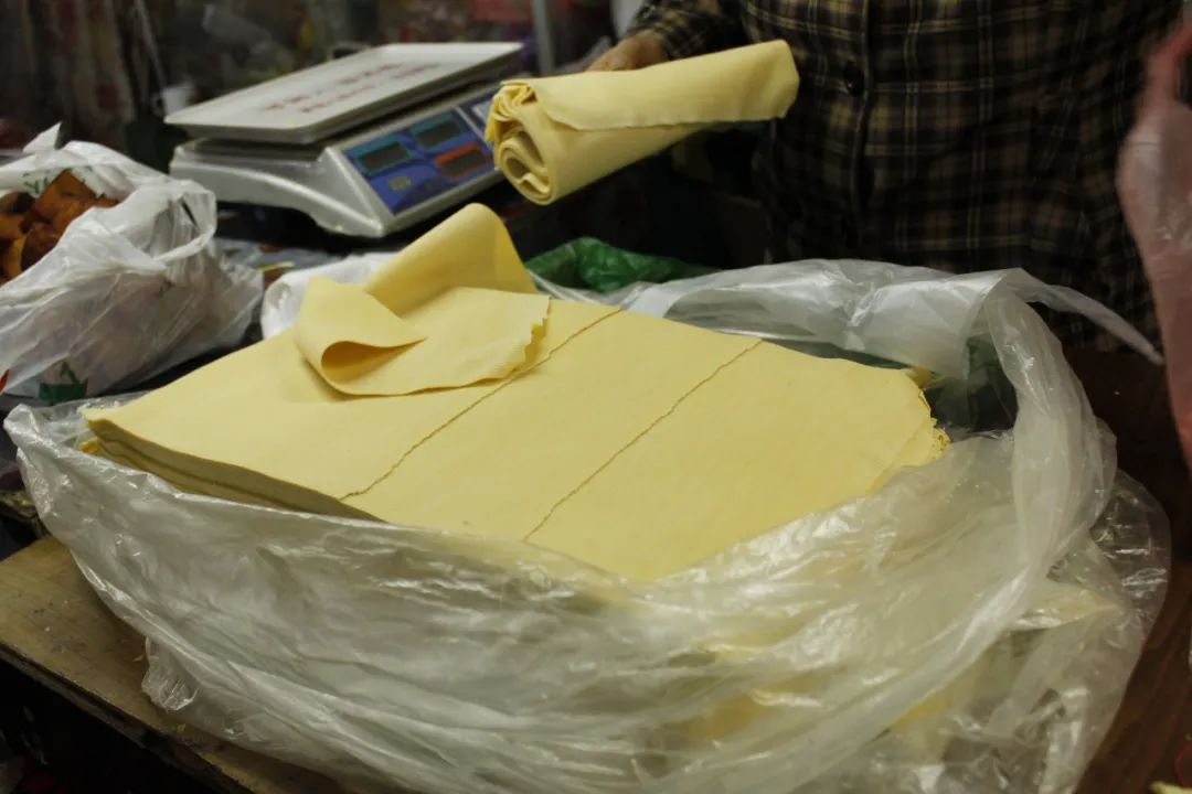 ■ 腐皮、腐竹、豆结大家都见过牛奶煮沸后放凉会在表面出现一层“奶皮子”吧,豆浆也会发生这样的事,揭下来的那层膜再晒干就是腐皮。腐皮里浓缩了蛋白和脂肪,并因为美拉德反应而变成金黄色。火锅店里金黄色的油豆皮,基本和腐皮是一个意思。