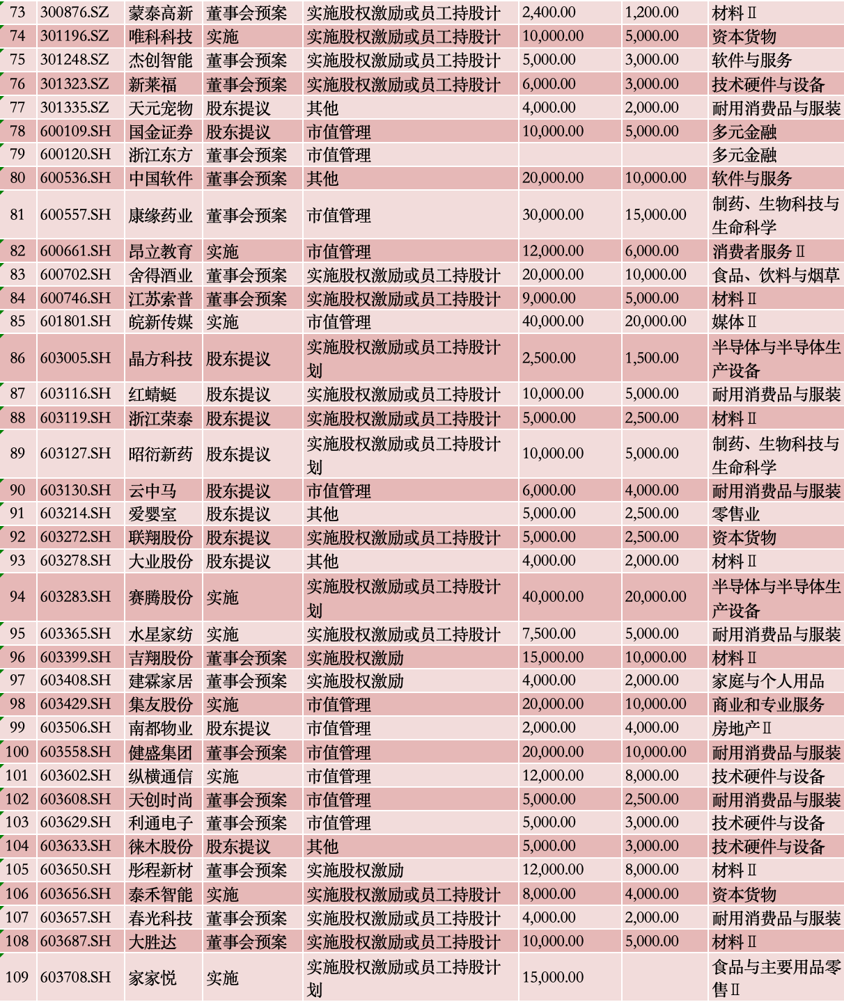 整体来看,据澎湃新闻记者计算,当晚涉及的回购金额上限超过177亿元,下限超过91亿元,回购目的主要为实施股权激励或员工持股计划,或是市值管理。