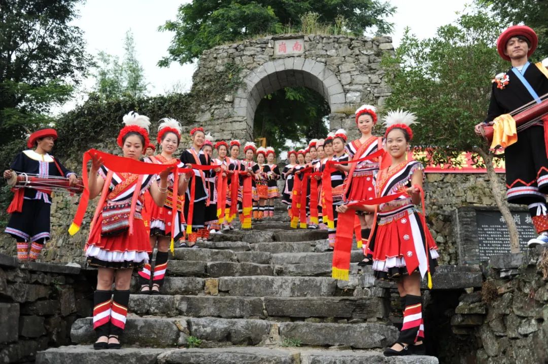 △连南瑶族自治县,南岗千年瑶寨举行隆重的迎客仪式。