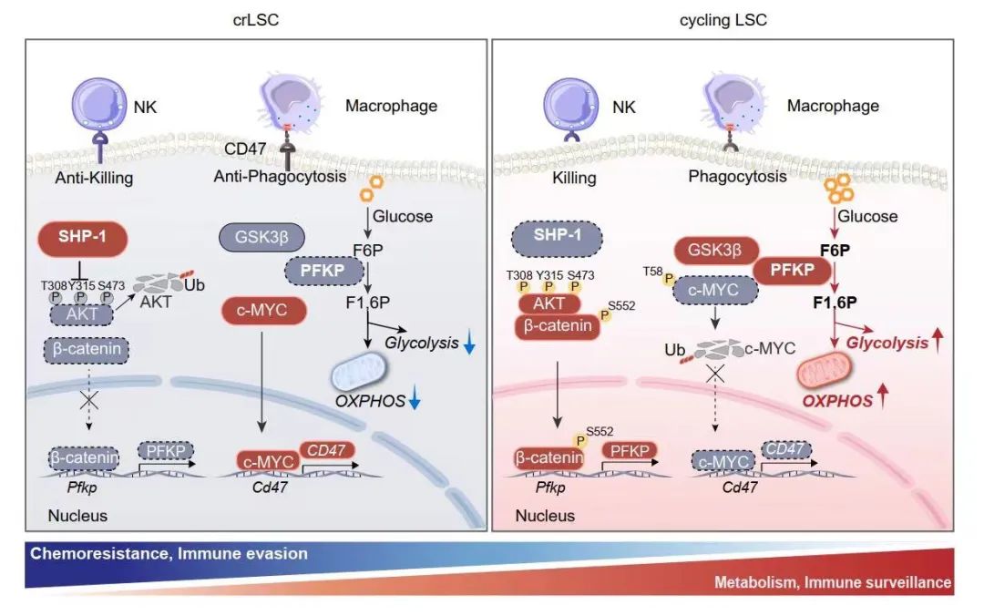 此外,研究团队还发现crLSC具有强大的免疫逃逸能力,并证实抑制SHP-1可以有效增强巨噬细胞和NK细胞对crLSC的免疫监视作用。研究揭示抑制SHP-1引起PFKP上调,而代谢酶PFKP可有效促进MYC蛋白的降解,进而在crLSC中降低CD47等免疫逃逸分子的表达,增强了免疫系统对crLSC的识别和杀伤作用。