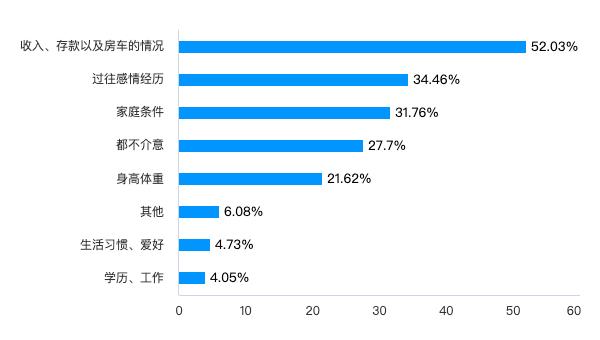 ▲图片来源:问卷调查在我们的调查中,大家最反感的是问「收入、存款以及房车情况」,同时「过往的感情经历」与「家庭条件」也让不少人反感。