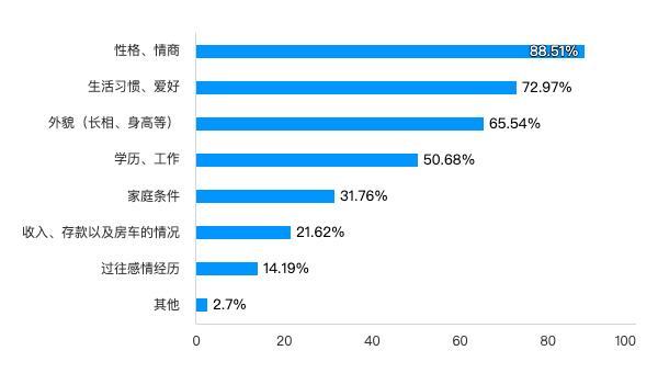 ▲图片来源:问卷调查在第一次见面最关心的事里,「性格、情商」位居第一,第二就是「生活习惯、爱好」,远超收入条件。这两大因素非常影响长期相处的质量,可见大家对相亲还是保持着一定的理性,并不会仅仅因为对方的经济条件适合就冲动决定。