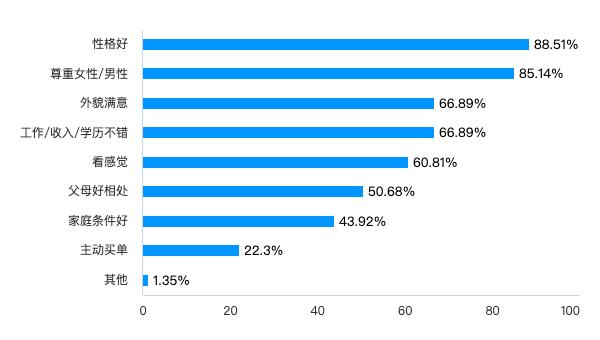当被问到什么样的相亲对象想让你继续发展时,性格好和尊重女性排名最靠前。