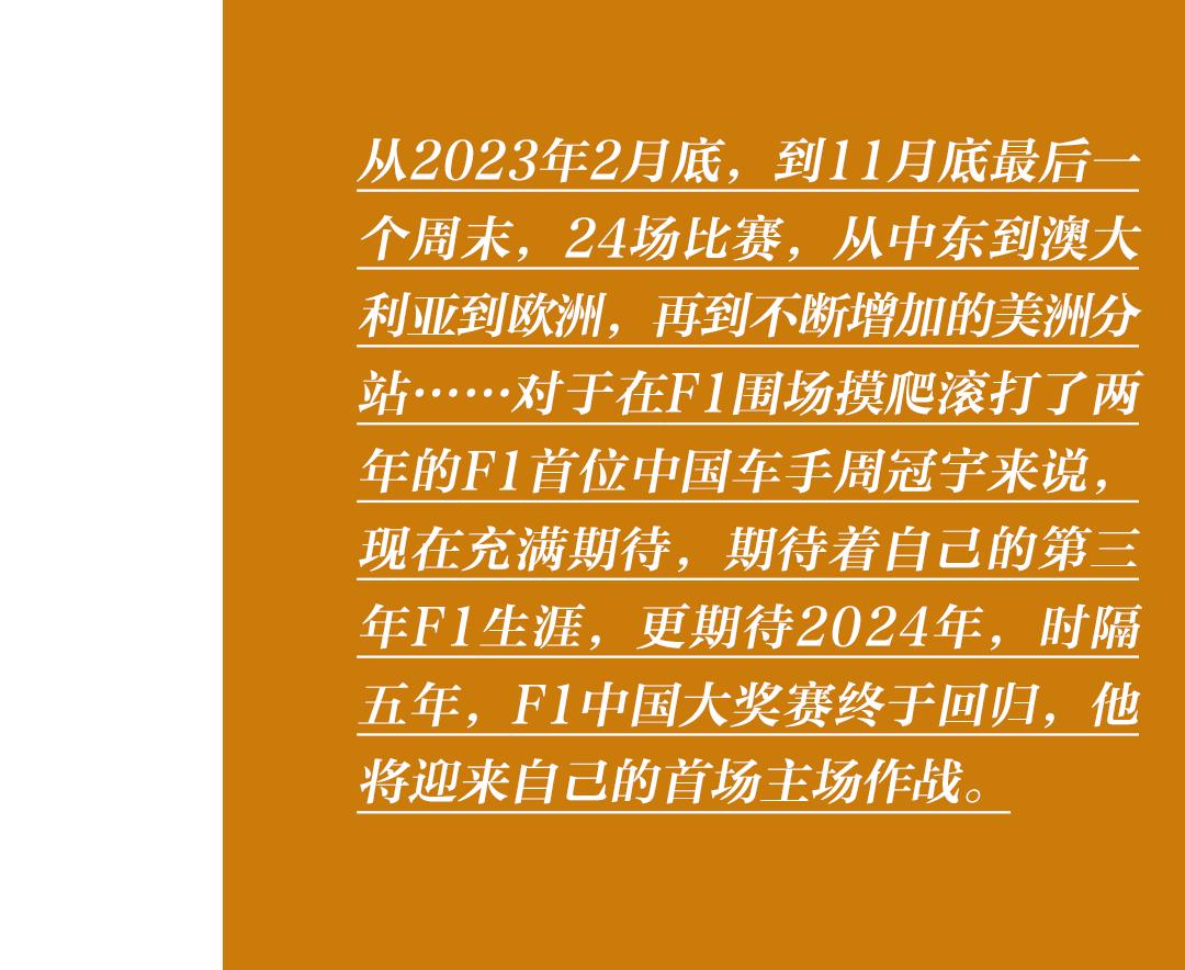2023年,是周冠宇的第二个本命年,两个本命年之间正是他从出国试水专业赛车这条路到走进F1站稳脚跟的十二年。“其实每一年,尤其是最近这几年,自己都有很大的收获。无论是拥有了更多的车迷,还是得到了更多人的认可,对我来说,这都是在自信心上获得的很大的肯定,”周冠宇说道,“本命年的话,怎么说,肯定从传统习俗上觉得会有一些不走运,感觉是有一些不顺利,但本年度唯一的遗憾就是自己的进步很难在最终的成绩单上面体现。”