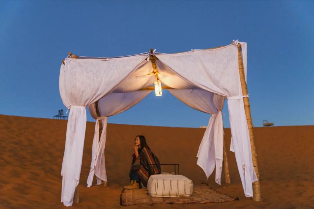 撒哈拉看着斜影随时间在沙漠中交替变换,享受着细小沙粒在脸上的拍打,安静地感受着撒哈拉迷人的魅力,享用一杯柏柏尔茶,夜宿于Halmas柏柏尔帐篷,欣赏沙漠的璀璨星空,是解锁撒哈拉的最美好姿势。