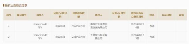 近日,据国家企业信用信息公示系统显示,捷信消金23.1亿元股权被其母公司捷信集团(Home Credit N.V)质押给了天津银行。