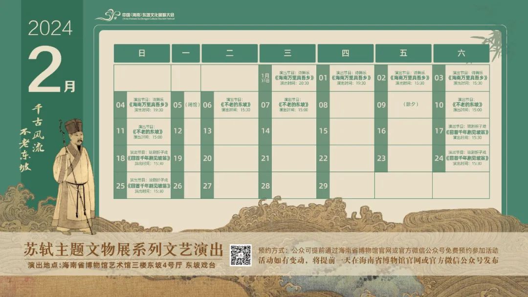 作为“千古风流 不老东坡——苏轼主题文物展”的配套活动,东坡戏台将分时间、分场次循环推出相关的文艺演出节目,市民游客可以根据官方公布的演出时间地点及预约方式到场观看。此外,为了进一步丰富苏轼主题文物展内容,激发东坡题材剧目演出市场活力,海南省旅文厅还以“揭榜挂帅”的方式选拔出大型古装黄梅戏《东坡》、琼剧《苏东坡在海南》、音舞诗画《不老的东坡》、苏东坡音乐诗剧《人生的盛宴》、苏东坡主题昆曲《明月几时》、大型音乐情景剧《苏轼在密州》等6部省内外东坡题材优秀剧目,主题文物展期间在海口市各大剧场(院)演出。