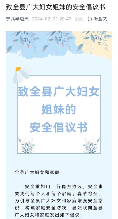 宁武县妇联通过公众号向全县家庭发出禁止燃放烟花爆竹的倡议。