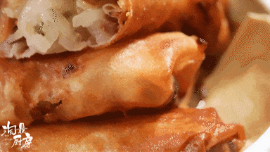 这样的春卷皮按分量卖,拿回家还是热乎乎的。小朋友要帮忙做一件事,就是把这一叠春卷皮,一张张有耐心的“分开”,免得冷却后春卷皮黏在一起。刚从油锅里炸出来的春卷金光灿灿,外脆里香,沾点醋吃,标志着年夜饭的正式开始。