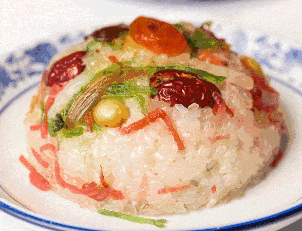 老底子上海人还是最爱传统的猪油八宝饭,用糯米饭拌上糖和猪油,放上莲子、红枣、金橘脯、桂圆肉、蜜樱桃、蜜冬瓜、瓜子仁等,撒上红、绿梅丝,每一种都有着美好的寓意。