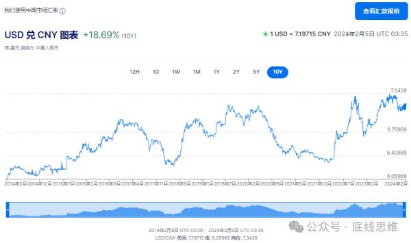 然而,于此同时,去美元化热潮中,中国的人民币兑美元汇率相继于2022年和2023年出现两轮贬值,人民币兑美元汇率中间价最高触及7.24,至今仍在7以上。