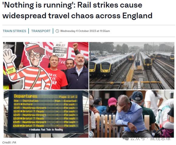 英国铁路工人罢工造成英格兰铁路系统停摆,以上为iTV2023年10月4日报道截图在这个意义上,俄乌冲突也使美西方国家处在一个十字路口,如果控制不了通货膨胀,就有可能出现工资-物价恶性循环的社会问题。