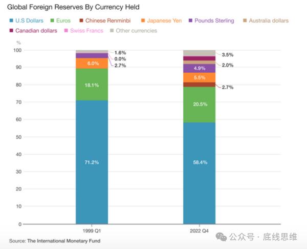 美元在全球央行外汇储备中的占比,从1999年一季度的71.2%下降到2022年四季度的58.4%。中国人民币2022年四季度的占比增加为2.7%从这个意义上,人民币如果成为国际货币,也会同样面对“特里芬难题”,也正是因为这个原因,如果深陷特里芬难题困境,唯一的出路是建立超主权货币,用超主权货币作为国际货币。