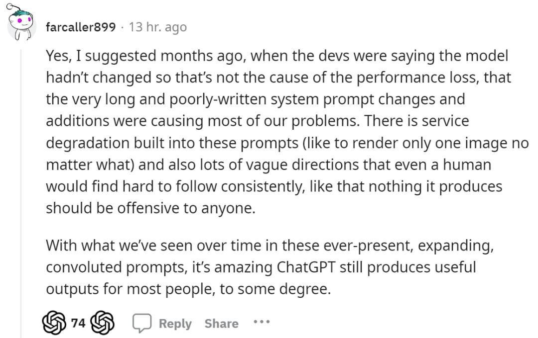 有网友表示:「几个月前在 ChatGPT 性能下降时,我就建议过:非常长且写得不好的系统 prompt 更改和添加导致了大多数问题。这些 prompt 中内置了服务退化(比如无论如何只渲染一张图像),并且还有许多模糊的指令,即使是人类也很难始终如一地遵循,比如它产生的任何内容都不应该冒犯任何人。」