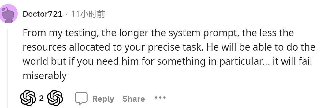 「根据我的测试,系统 prompt 越长,分配给用户精确任务的资源就越少。」另一位网友说道。