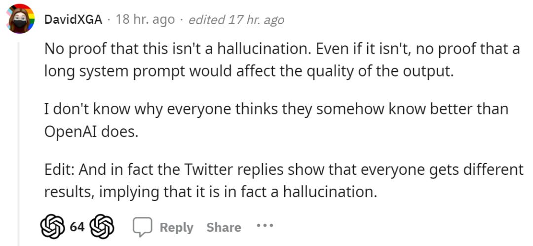 还有人表示:「没有证据表明较长的系统 prompt 会影响输出质量,我不知道为什么每个人都认为他们比 OpenAI 更了解自己。」