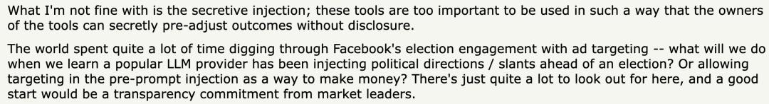 从公开的角度讲,有网友表示反对秘密注入 prompt,因为「这种行为对人类视角的多样性缺乏同理心。这些工具太重要了,不能以工具所有者在不披露的情况下预先调整结果的方式使用。」
