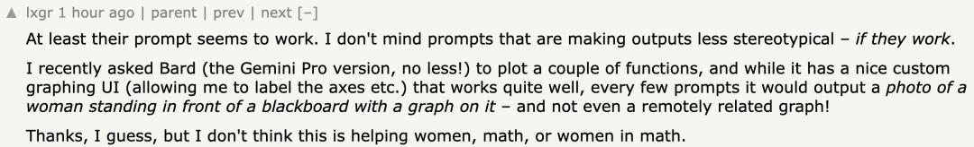 还有网友表示:「至少 OpenAI 注入的 prompt 似乎有效,我不介意那些让输出不那么刻板的 prompt—— 如果它们有效的话。」并举例说明谷歌的 Bard(Gemini Pro 版本)存在相关问题。