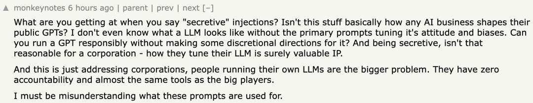 有人从商用 GPT 的角度指出:「这难道不是人工智能企业塑造其 GPT 的基本方式吗?如果不给 GPT 一些恰当的指令,能否保证负责任地运行 GPT 模型?保密对于商业公司来说不是很合理吗?他们如何调整其 LLM 是有价值的知识产权。」