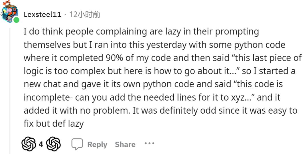 最后,还有网友继续抱怨「昨天我在编写 Python 代码中遇到了这个问题,它完成了代码的 90%,然后说最后一段逻辑太复杂了,但告诉我如何去做...... 之后我开始了一个新的聊天,给了它自己写的 Python 代码,并说这个代码不完整 —— 你可以将它所需的行添加完整吗…… 然后 ChatGPT 就毫无问题地添加了代码。从这可以看出,ChatGPT 绝对是懒惰的。」