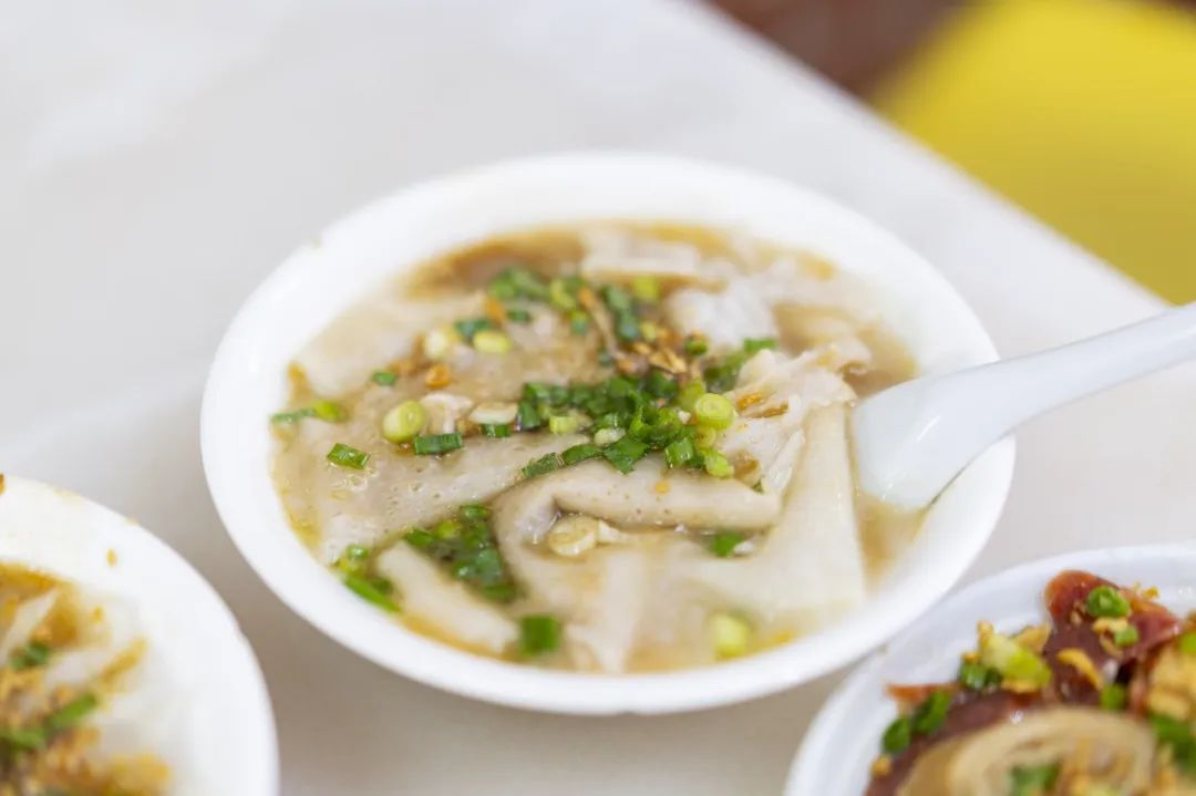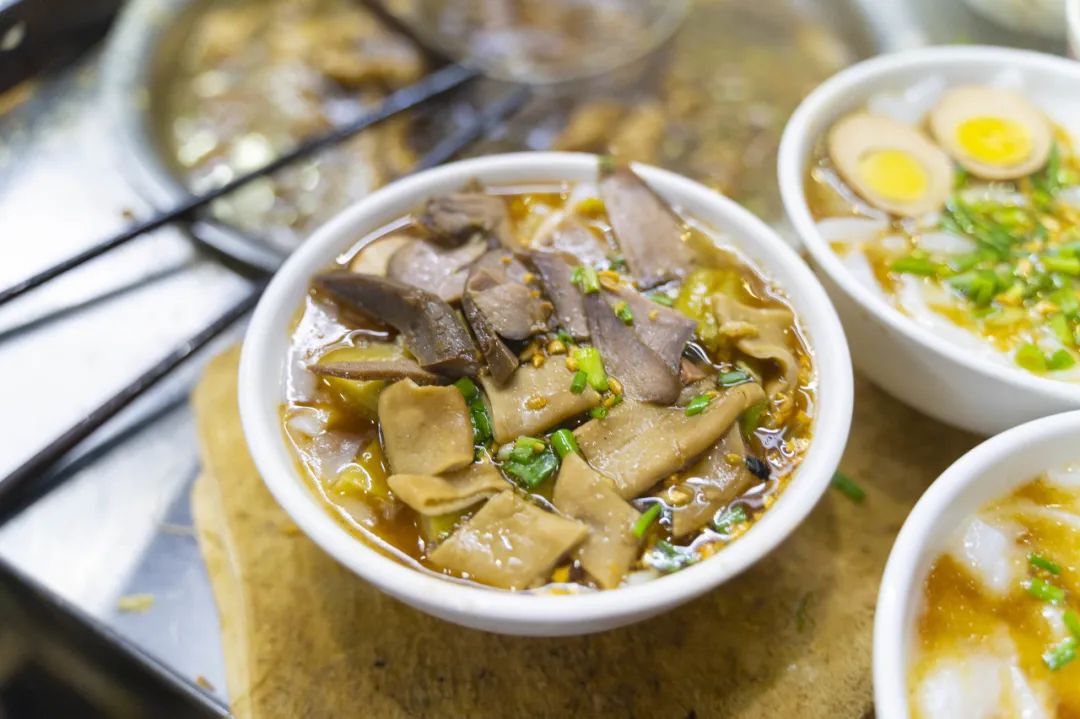粿汁在潮州街上,随处可见卖粿汁的小食摊,淋上浅棕色的卤汁,再点些卤猪肠、卤肉、卤蛋、豆干或菜尾等,这就是粿汁了,粿汁要趁热吃,非常爽口,越吃越有味。