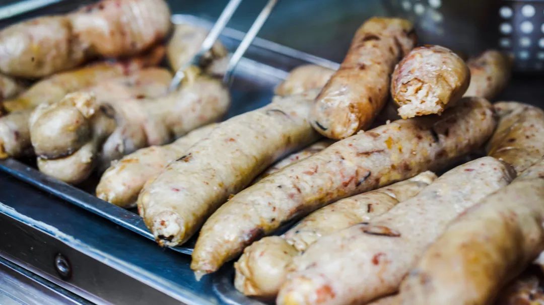 糯米猪肠糯米猪肠是潮汕地区民间传统小吃,将糯米、猪肉、香菇、虾、莲子等辅料拌匀,塞进洗好的猪肠中,两端用纱线扎紧,放开水锅里煮,捞出斜切成小片,就可以蘸吃。