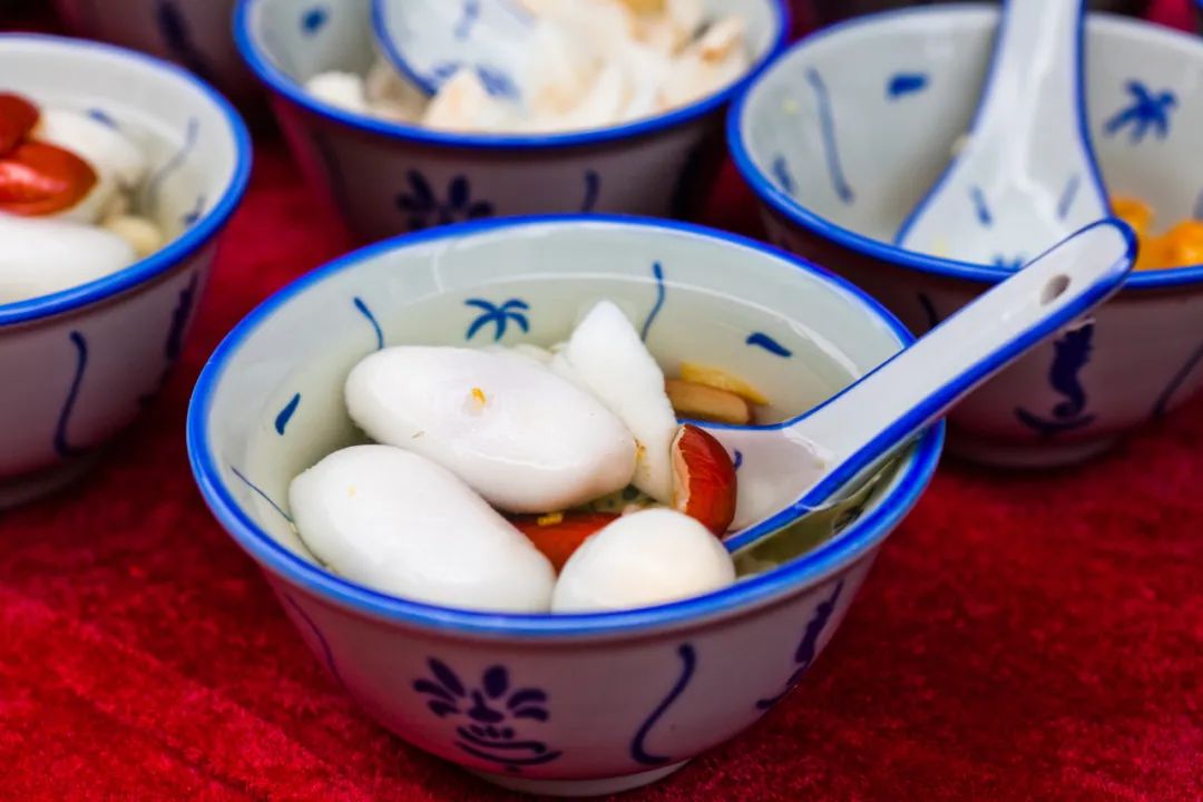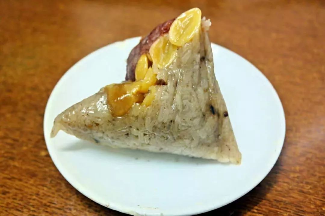 双烹粽球潮汕“双烹”粽子的馅料很独特,一半咸、一半甜,咸馅主要是咸蛋仁、虾米、香菇、腊肠、翅脯、莲子、栗子和南乳猪肉;甜馅主要是水晶馅、乌豆沙馅或红豆沙馅和甜糯米。