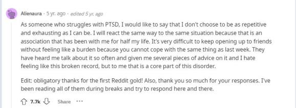 “作为一名与创伤后应激障碍(PTSD)斗争的人,我想说,我并不是有意让自己陷入重复和疲惫之中。面对相同的情况,我似乎总是不由自主地做出相同的反应,仿佛这已成为我生命中不可避免的一部分。