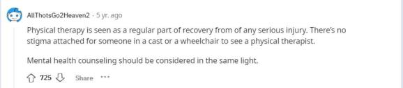 “物理治疗通常是各种严重问题的首要治疗手段。对于戴着石膏或坐在轮椅上的人来说,不会有人因为他们去看医生就对他们评头论足。同样,心理健康咨询也应该被以同样的态度看待。”