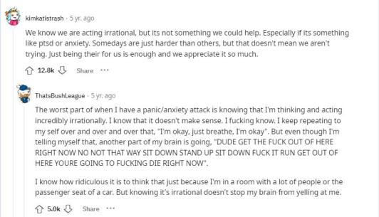 回复:“当我恐慌/焦虑发作时,最糟糕的是我知道自己的想法和行为都是非常不合理的。我不停地对自己重复,“我没事,深呼吸,我没事。”但即便我这样告诉自己,我脑海中的另一部分却在大喊,“伙计,马上从这里逃出去,不,不是那边,坐下,站起来,坐下,快跑,从这里逃出去,你现在就要死了。我知道这样想很荒谬,因为有时我待在一个人多的房间里或者坐在车的副驾驶座位上都会产生这样的想法。但即使知道这是不理智的,也无法阻止我的大脑对我大喊大叫。”