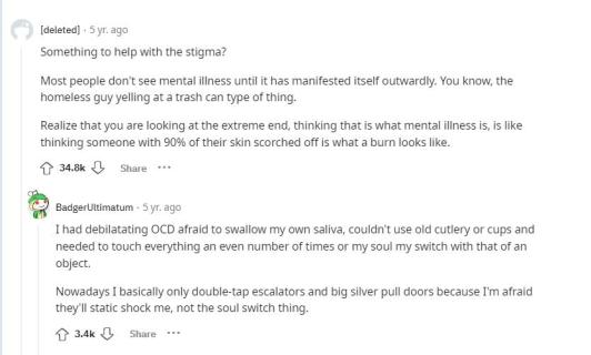 “如何帮助减少关于心理疾病的污名呢?大多数人在心理疾病表现出明显外部症状之前是察觉不到的。就像那些流落街头,对着垃圾桶大喊大叫的人。我们需要意识到,我们所看到的只是极端案例。认为那就是心理疾病的全部,就像认为一个人身上90%的皮肤被烧伤是普通烧伤的样子一样。”