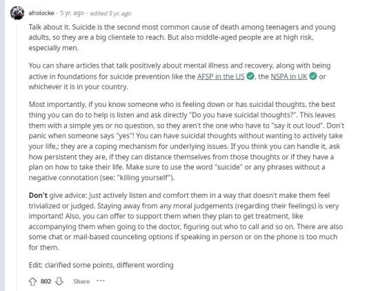 如果你认为自己可以处理,可以询问他们这种想法有多顽固,是否可以远离这些想法,或者他们是否有如何结束生命的计划。确保使用 "自杀suicide "一词或任何没有负面含义的短语(如:"killing yourself")。