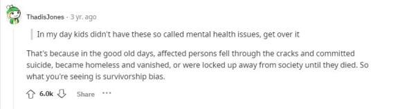 那是因为在过去的美好时光里,受影响的人都是在夹缝中挣扎,然后自杀、无家可归、消失,或者被关起来,远离社会,直到死去。所以你看到的只是幸存者偏差。”
