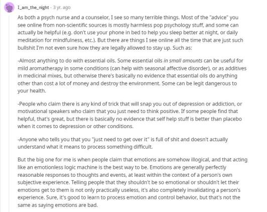 作为一名护士和心理咨询师,我在工作中看到了很多可怕的事情。你在网上看到的大多数非科学来源的 "建议",大多是无害的流行心理学的东西,有些实际上是有帮助的(例如,不要在床上使用手机,以帮助你晚上睡得更好,或者每天冥想以保持正念,等等)。但我经常在网上看到一些胡言乱语的东西,我都不知道这些东西为什么还能存在。比如:
