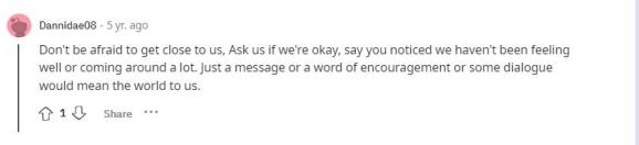 “不要害怕接近那些有心理问题的人,问问他们是否还好,说你注意到他们感觉不舒服或最近的联系次数变少了。有时候仅仅只是一句关心、一句鼓励或一些闲聊,对他们来说就意义重大。"