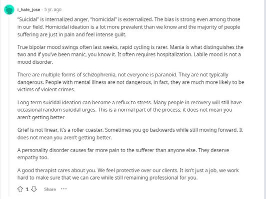 “自杀倾向”是内化的愤怒,“杀人倾向”则是外化的。即使在我们这个领域,这种偏见也是很强的。实际上,杀人倾向比我们所知的要普遍得多,大多数受困于此的人只是感到痛苦和深深的内疚。