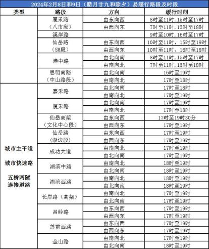 其中,2月8日和9日(腊月廿九和除夕)晚高峰将会出现较为明显的车辆集中出行,主要缓行路段在“五桥两隧”及其连接道路、城市快速路、城市主干道等,各高速出入口、厦门站、厦门北站,以及SM城市广场、八市、花鸟市场、中埔海鲜市场等年货采办集市周边道路车流量也将明显上升。2月16日和17日(正月初七和初八)会出现小规模返程车流,主要集中在杏林、厦门等高速出口,“五桥两隧”进岛方向和岛外段连接道路。