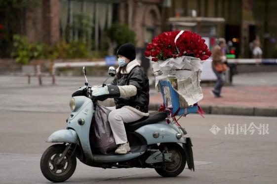 街头,一女子拉着一大束玫瑰花。