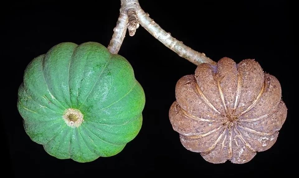 响盒子树的果实外观看起来就像是一个南瓜一样,直径在5-8厘米的样子,有16个心皮呈放射状排列,活脱脱就是一个挂在树上的“小南瓜”。