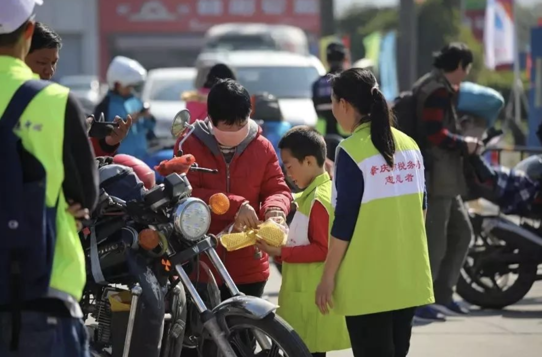 △春运“暖流行动”,志愿者为返乡摩托大军送上一杯杯热茶。