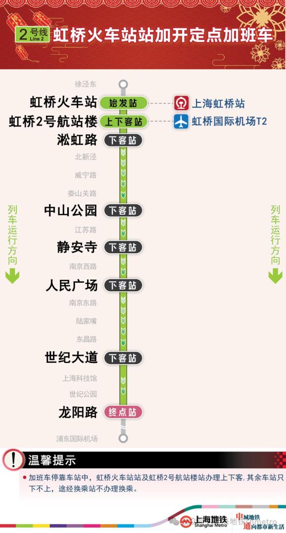 “春运”期间,每逢周日2号线虹桥火车站站夜间定点加班车延至0点 。2号线定点加班车始发站虹桥火车站站,终点站龙阳路站,中途停靠虹桥2号航站楼站、淞虹路站、中山公园站、静安寺站、人民广场站及世纪大道站。其中除始发站虹桥火车站站及虹桥2号航站楼站可上下客,其余各停靠站都只能下客,途经换乘站不可换乘。