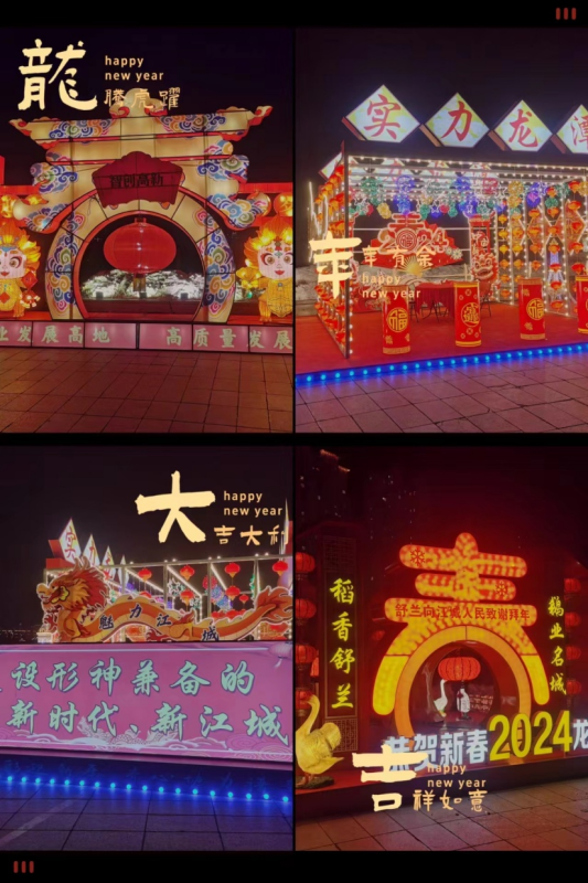 五彩缤纷的花灯无疑是拍照打卡的最佳去处。“双龙戏珠”的气势、“新春纳福”的吉祥,每一处花灯都透露出新年的好福气和好彩头,彰显出“新时代 新江城”的城市魅力。花灯游园会共设置13座大型主题花灯,围绕广场圆周排列,寓意“团团圆圆”“和和美美”。